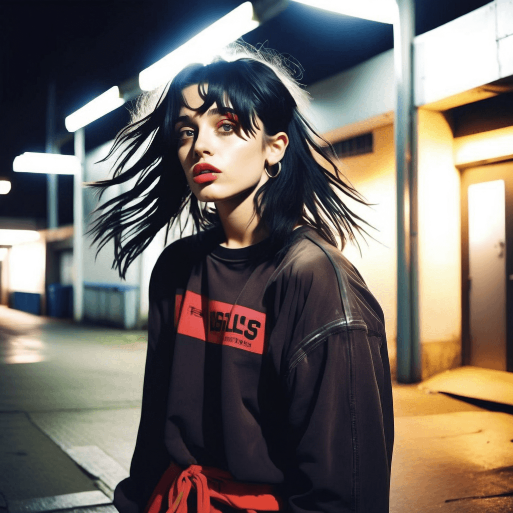 a realistic photograph, girl standing in a factory street alley in new york, sewing machines and the industrial era, synthwave art style, soviet samizdat, cold war era, drawn lines, ( asaf hanuka ), gta artstyle, hyper detailed, street wear, early 1978, Khrushchev, kennedy and the bay of pigs, samizdat passed through the streets, somewhere behind the wall.