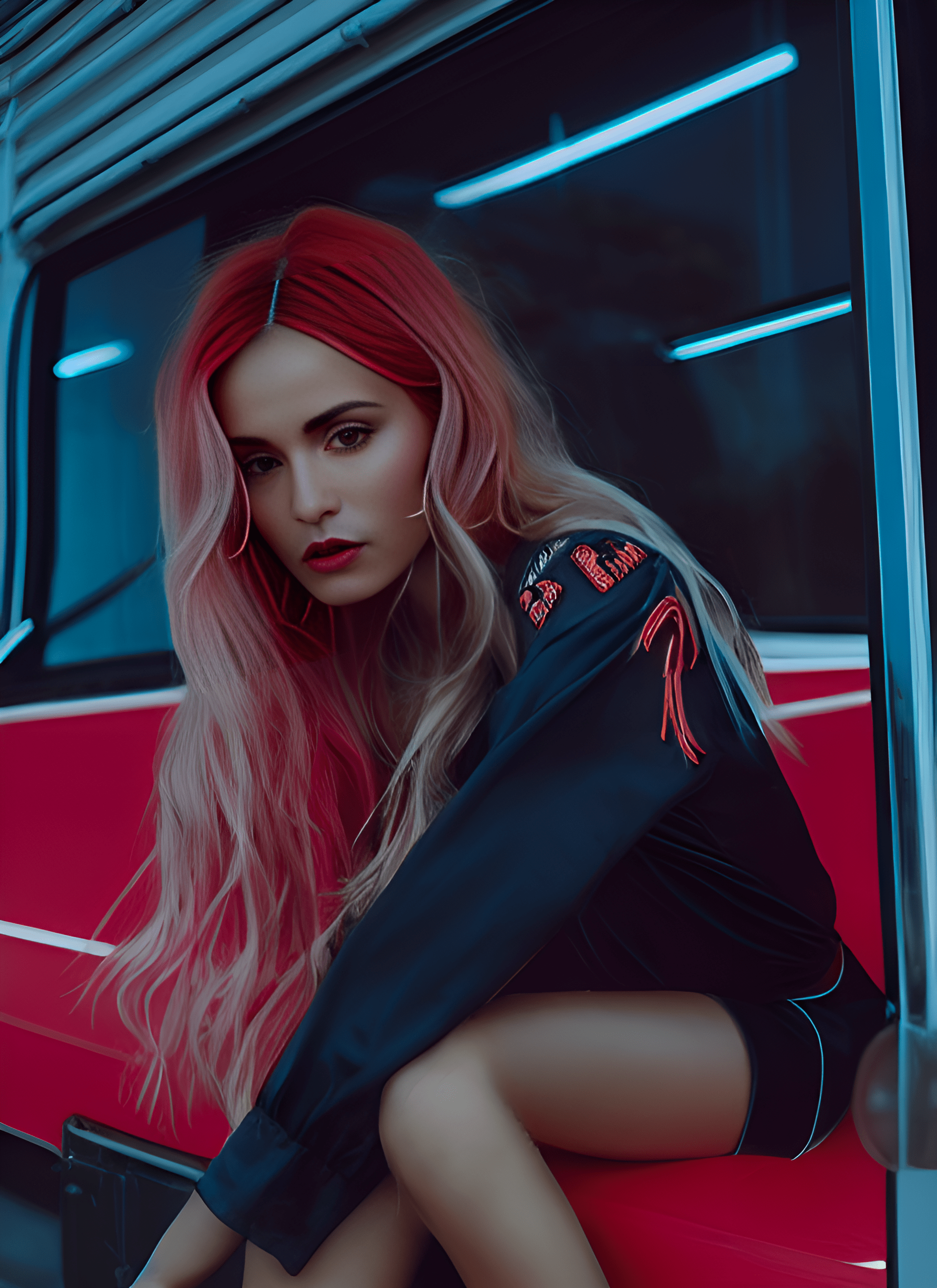 Dentro de una cámara presurizada sin techo. Su caminar activa sensores obsoletos. Plataforma de goma termoactiva, vestido de supervivencia urbana decorado con placas de identificación estéticas. Parece salida de un simulacro que nadie recuerda haber programado.