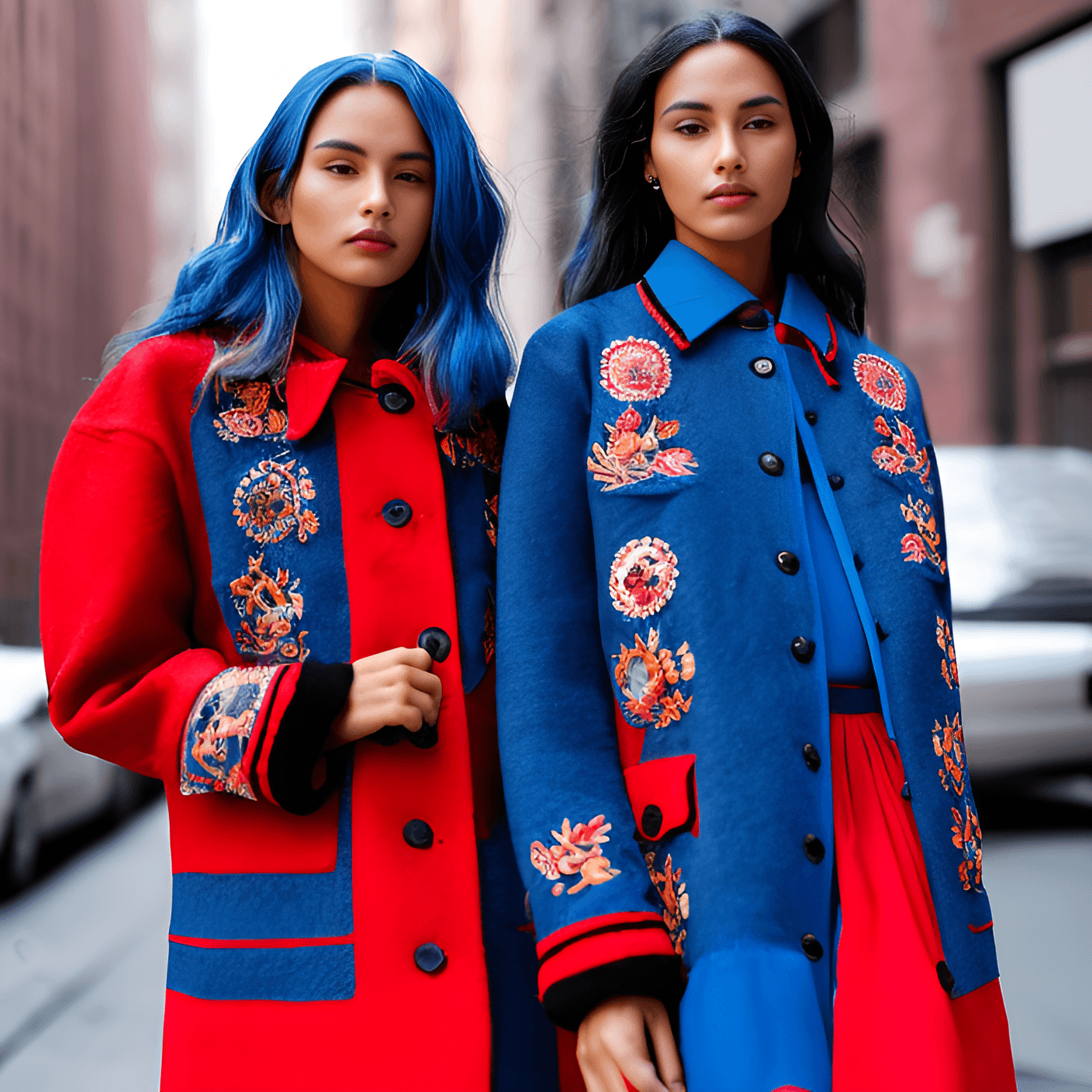 a center front view, close up, 2020, photograph of three beautiful tanned Female puerto rican model best friends with blue and white hair, wearing intricately embroidered oversized street wear red coats with buttons and short blue skirts with black printed stockings, ((( walking down the lower east side in the 2000s in early autumn))), highly detailed. walking down (((Manhattan in the 1990s))), highly detailed, 1990s manhattan , west soho streets , old new york , (( vintage americana )). lowres, cropped, jpeg artifacts, bad anatomy, text error, worst quality, amateur, multiple, gross, weird uneven, disfigured, kitsch, ugly, oversaturated, grain, low-res, Deformed, blurry, bad anatomy, disfigured, poorly drawn face, mutation, mutated, extra limb, ugly, poorly drawn limbs, missing limb, blurry, floating limbs, disconnected limbs, malformed hands, blur, out of focus, long neck, long body, ugly, disgusting, poorly drawn, childish, mutilated, mangled, old, surreal, ugly, tiling, poorly drawn hands, poorly drawn feet, poorly drawn face, out of frame, extra limbs, disfigured, deformed, body out of frame, blurry, bad anatomy, blurred, watermark, grainy, signature, cut off, draft.