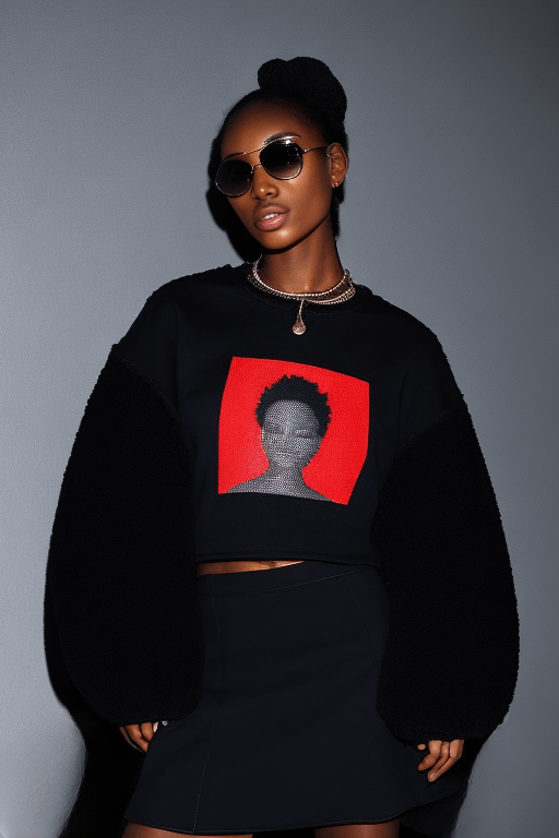 (a center front view portrait, 2012, photograph of a beautiful tanned black brooklyn female model wearing a a high visibility strip oversized fuzzy bomber jacket, graphic tee, mini red leather skirt and long red hair, white television sunglasses, walking down Manhattan lower east side in the 2000s at midnight, highly detailed) [dark, cartoon, ugly, gross, fat, oversized, city, fake, not mtv, 3d, disfigured, bad art, deformed, poorly drawn, extra limbs, close up, weird colors, poorly lit, dark colors, black, white, digital art, unrealistic, mountains, nature, hills, park, field, plain background, not racing car, not formula one, not racing track]