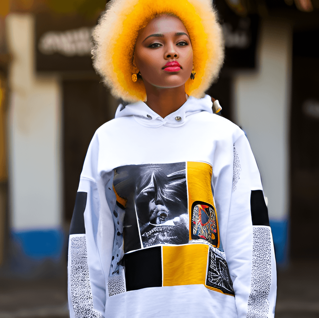 a center front view portrait, 2012, photograph of a beautiful south african female model wearing streetwear, a yellow t-shirt with a supreme hoodie with blue, green and white text and graphic prints, a ripped denim highwaisted jeans, black high top sneakers, white blue hair, red lipstick, walking down Manhattan in the 2000s, highly detailed, brooklyn buildings. lowres, cropped, jpeg artifacts, bad anatomy, text error, worst quality, amateur, multiple, gross, weird uneven, disfigured, kitsch, ugly, oversaturated, grain, low-res, Deformed, blurry, bad anatomy, disfigured, poorly drawn face, mutation, mutated, extra limb, ugly, poorly drawn limbs, missing limb, blurry, floating limbs, disconnected limbs, malformed hands, blur, out of focus, long neck, long body, ugly, disgusting, poorly drawn, childish, mutilated, mangled, old, surreal, ugly, tiling, poorly drawn hands, poorly drawn feet, poorly drawn face, out of frame, extra limbs, disfigured, deformed, body out of frame, blurry, bad anatomy, blurred, watermark, grainy, signature, cut off, draft