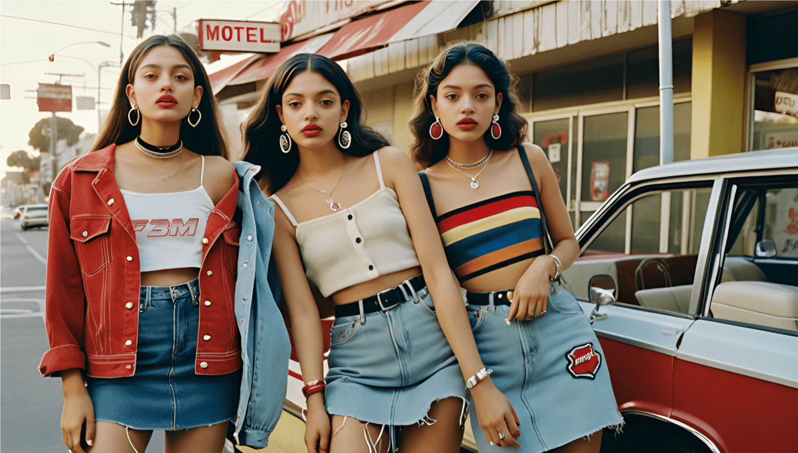 Cinturones negros gruesos, crop top abotonado de tirantes finos, chaqueta granate caída del hombro, denim claro rasgado, capas de rayas y cadenas plateadas. Los detalles importan, al atardecer jugaremos videojuegos.
