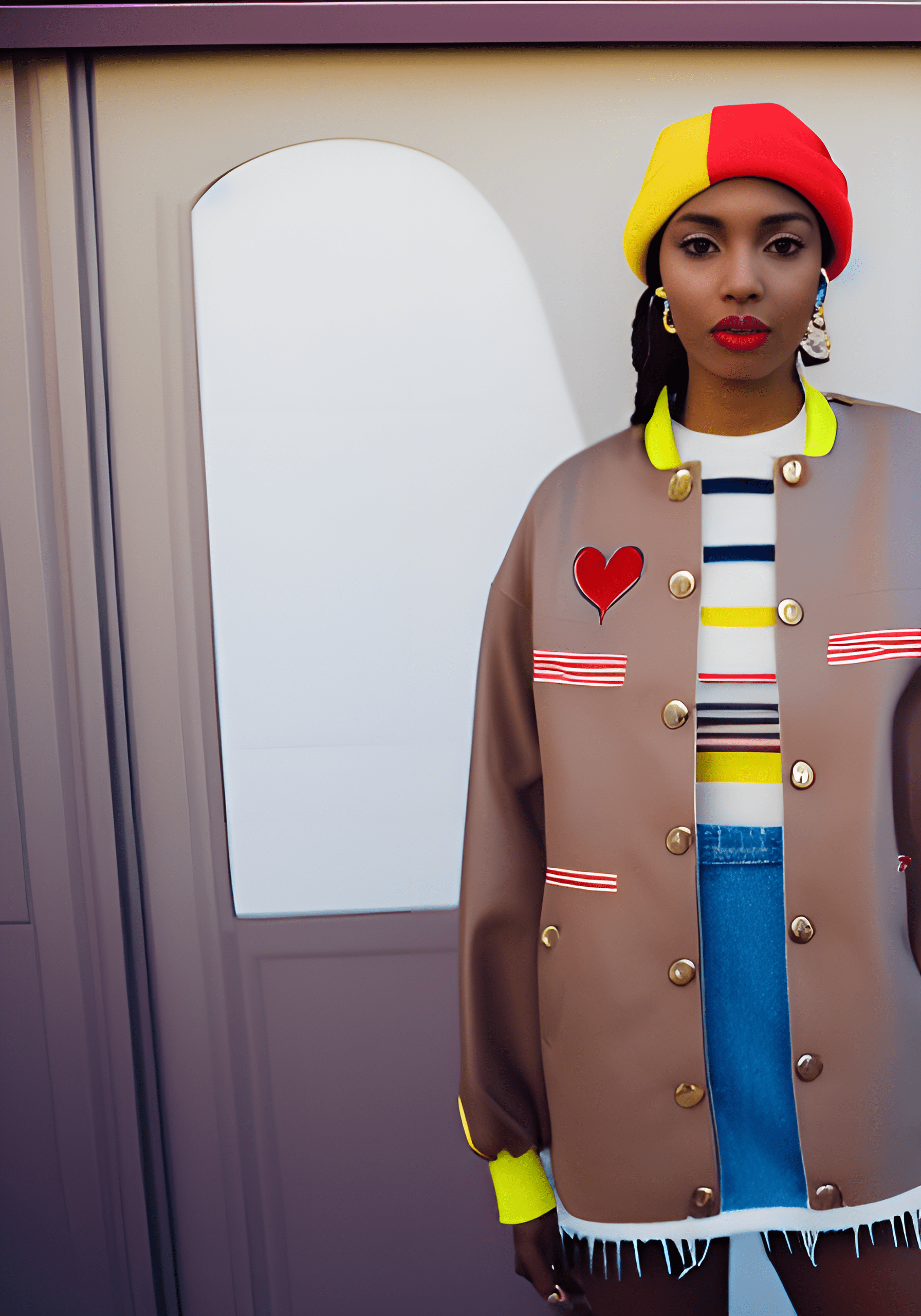 Unmarked district near the edge of the grid. Reactive stripes glow like circuit overloads. Outerwear reminiscent of a mid-tier admiral lost to time. Electrocuted shoelaces whip in perfect cadence. She moves like a static charge about to choose its next target.