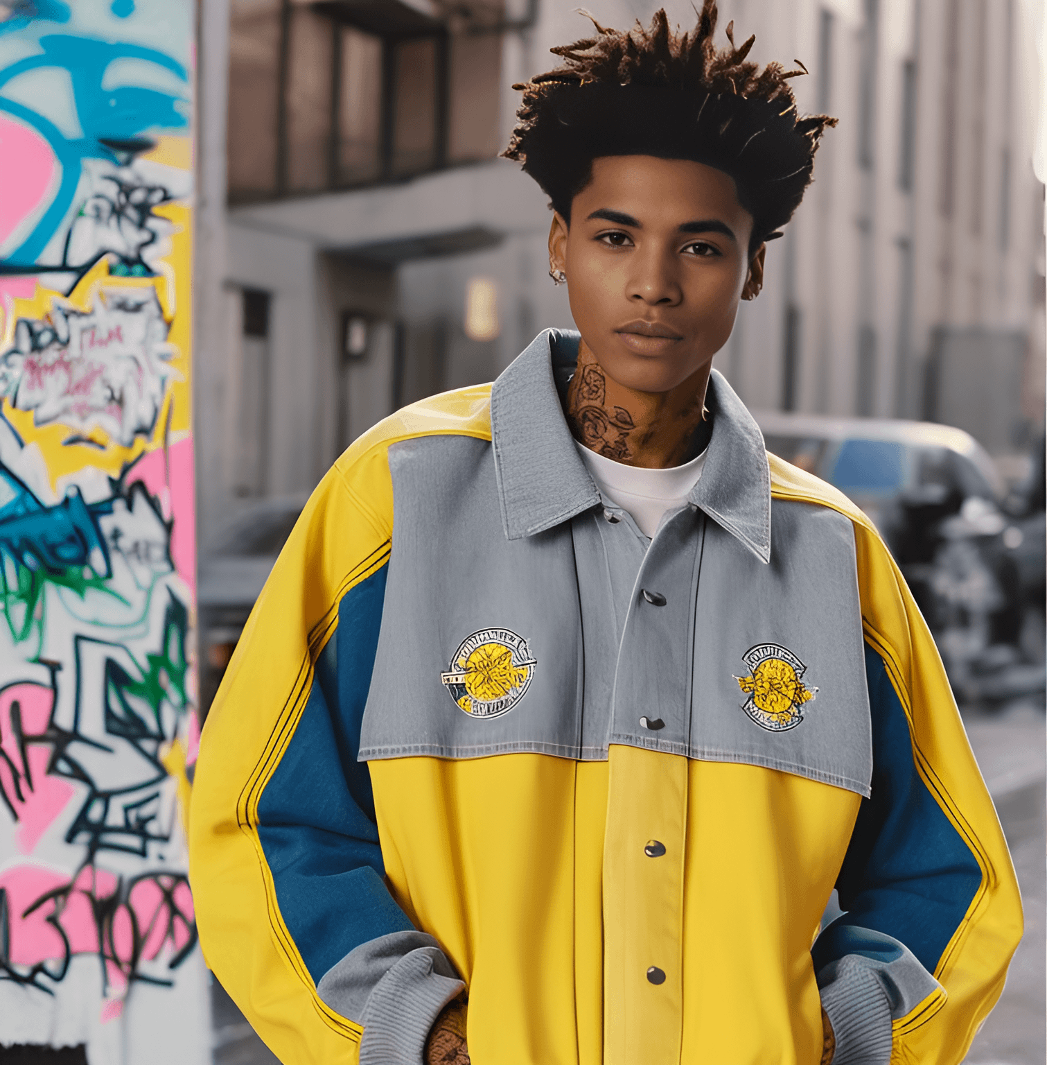 (perfect symmetrical face hyperrealism portrait of a mixed South African hardworking ((male boyfriend)) wearing high fashion streetwear, an oversized gothic ed hardy style denim cold war jacket with blue and yellow stripes, with gray graffitti new york lower east side streets in the background, graffitti, tattoos, skateboarding, 1978, black and white, trending on tumblr, handsome, (90s style aesthetic), ((photography)), (((captured with a fujifilm xt-3 vintage film))), ((((photorealistic)))), ((precisionism))) [dark, cartoon, ugly, gross, fat, oversized, city, fake, not mtv, 3d, disfigured, bad art, deformed, poorly drawn, extra limbs, close up, weird colors, poorly lit, dark colors, black, white, digital art, unrealistic, mountains, nature, hills, park, field, plain background, not racing car, not formula one, not racing track]
