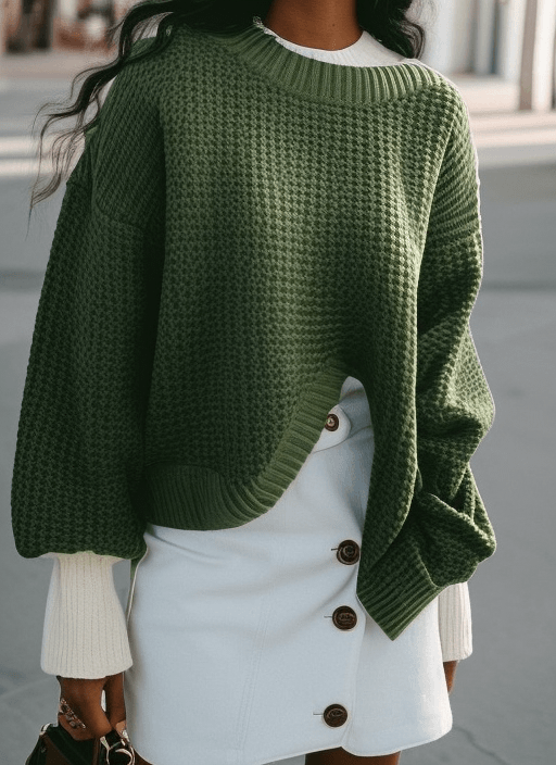 Mixtape interfaces. Bell sleeve hunter green interlocked cable knit pullover, extended cream cuffs, white rural button up skirt.