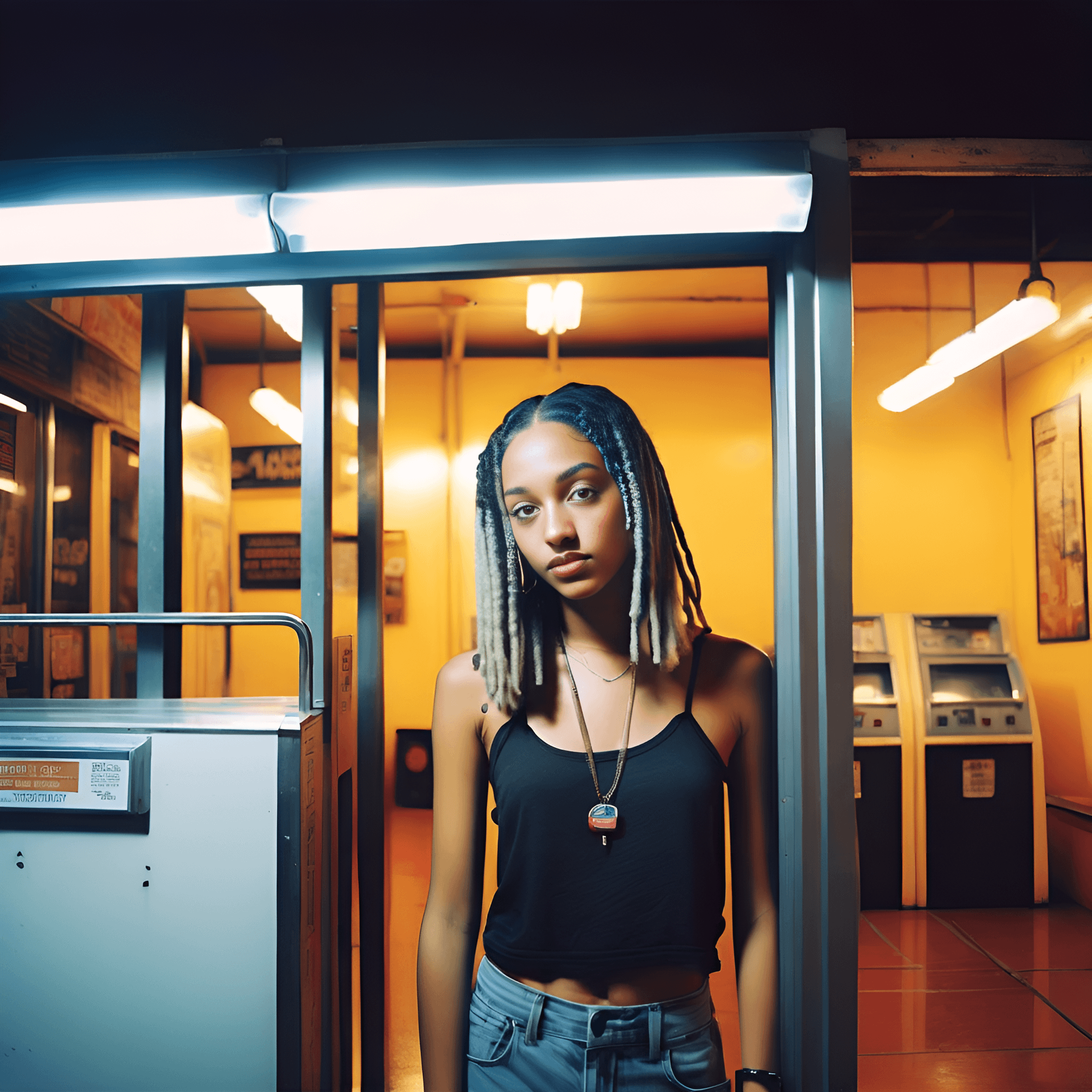 a realistic photograph, girl standing in a factory street alley in new york, sewing machines and the industrial era, synthwave art style, soviet samizdat, cold war era, drawn lines, ( asaf hanuka ), gta artstyle, hyper detailed, street wear, early 1978, Khrushchev, kennedy and the bay of pigs, samizdat passed through the streets, somewhere behind the wall.