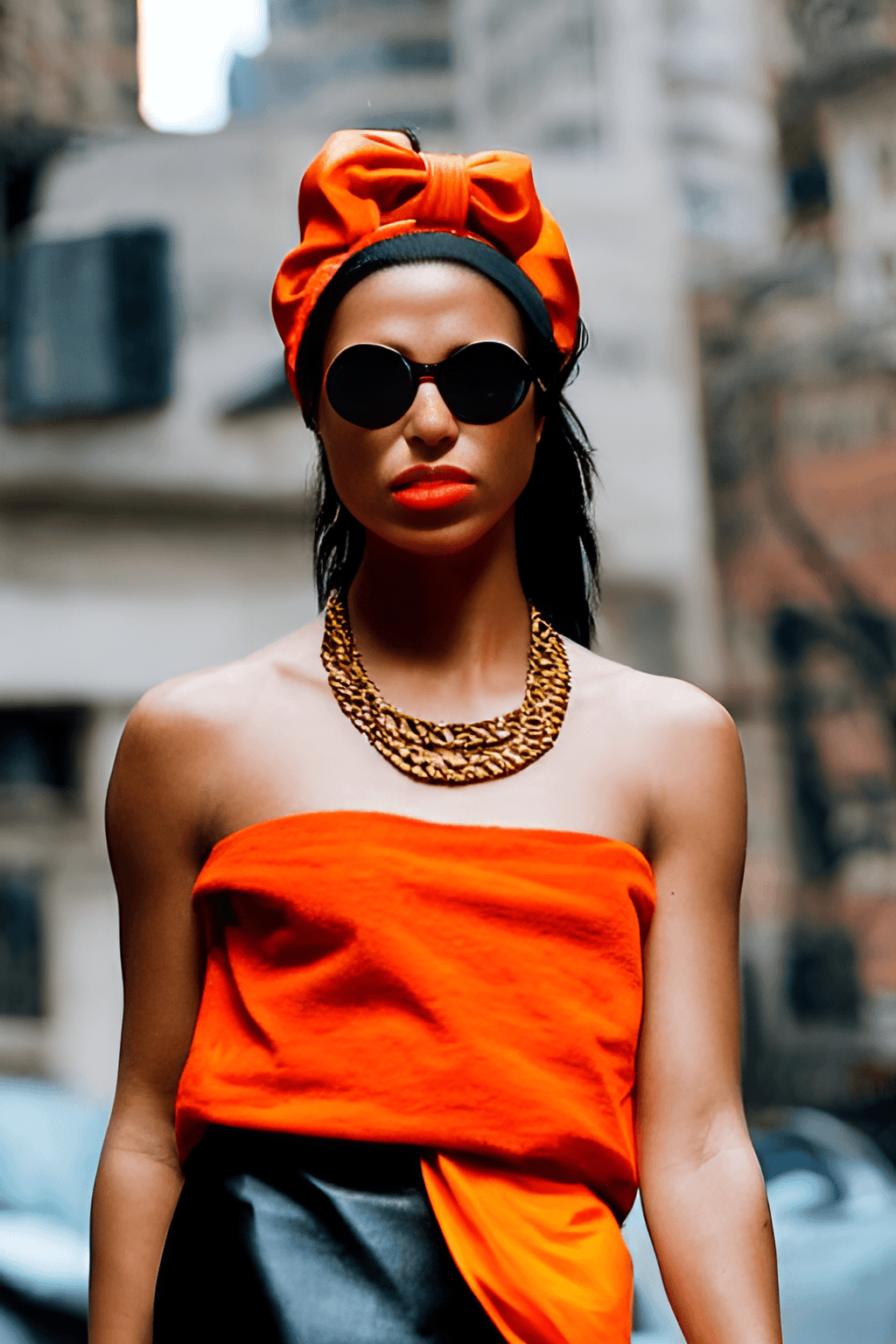 A virtual extension through the accelerating lexicon. Between the real and hyperreal an unwitting simulacrum, a deliberate distraction within rude awakenings. Seduced by the allure of the blue light glow. Delectable style. Vibrant shades of burnt orange, reflective black, multi-layer thick gold chain curb link chokers. A loose cotton strapless crop top, geometric bandana and ultra high waisted leather ruffle mini skirt.