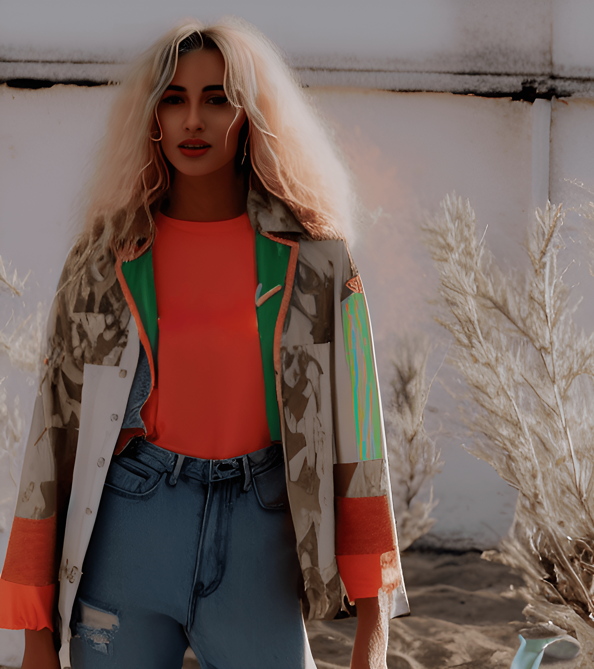 Stratosphere walkaway in a decommissioned launch base. Smooth composite fabrics in mission-blue and jetfoil orange. Neon piped veins trail down her limbs. Utility earrings spark softly as she turns. Zero drag. Full voltage.