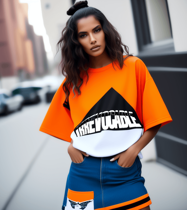 a center front view portrait, 2012, photograph of a beautiful puerto rican female model with light blonde and blue hair tied up wearing streetwear, patchwork oversized large graphic patchwork t-shirt with pink, black, yellow and red and black text and graphic prints, denim mini skirt ripped with a orange material band, black high top sneakers, walking down Manhattan in the 2000s, highly detailed, brooklyn buildings. lowres, cropped, jpeg artifacts, bad anatomy, text error, worst quality, amateur, multiple, gross, weird uneven, disfigured, kitsch, ugly, oversaturated, grain, low-res, Deformed, blurry, bad anatomy, disfigured, poorly drawn face, mutation, mutated, extra limb, ugly, poorly drawn limbs, missing limb, blurry, floating limbs, disconnected limbs, malformed hands, blur, out of focus, long neck, long body, ugly, disgusting, poorly drawn, childish, mutilated, mangled, old, surreal, ugly, tiling, poorly drawn hands, poorly drawn feet, poorly drawn face, out of frame, extra limbs, disfigured, deformed, body out of frame, blurry, bad anatomy, blurred, watermark, grainy, signature, cut off, draft