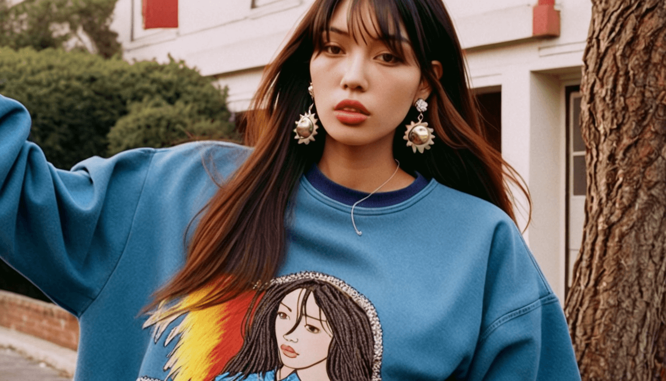 Sudadera azul oversized, estampado gráfico, llamas coloridas, aretes en forma de sol y reflejos delicados. En días ventosos finjo que estoy volando.