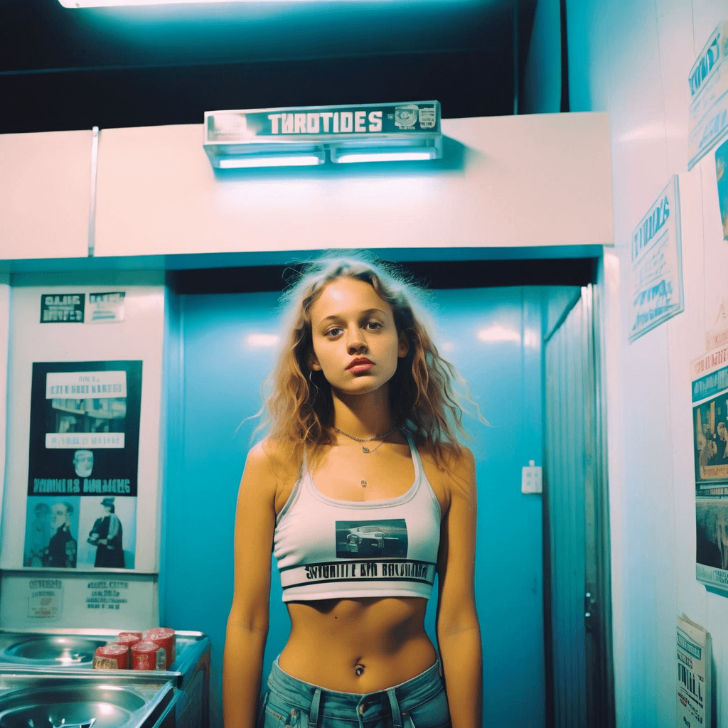 a realistic photograph, girl standing in a factory street alley in new york, sewing machines and the industrial era, synthwave art style, soviet samizdat, cold war era, drawn lines, ( asaf hanuka ), gta artstyle, hyper detailed, street wear, early 1978, Khrushchev, kennedy and the bay of pigs, samizdat passed through the streets, somewhere behind the wall.