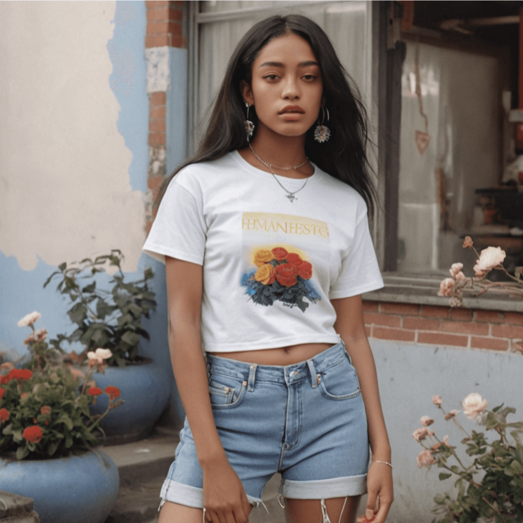 Jersey de algodón suave, rosas floreciendo estampadas debajo de mi manifiesto, mangas cortas ligeramente ajustadas, torso de corte suelto, estética casual, denim rígido sin elasticidad, dobladillo con vuelta, una cintura de talle alto que se ajusta a la cintura. El jardín de Alice no está muy lejos.