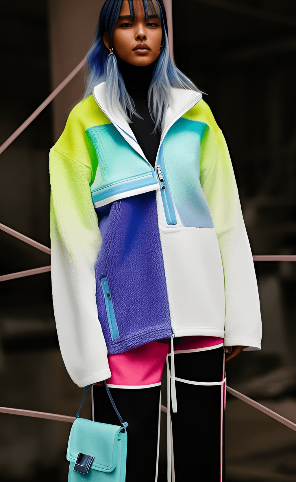 (perfect symmetrical face hyperrealism portrait of a beautiful female with light blue ombre hair wearing high fashion streetwear, a tight bodycon long sleeve neon yellow top, black and high visiblity worker cargo shorts, trending on tumblr, (70s style aesthetic, 1978 aesthetic, cold war influence), (((with an old mining town factory in the background, dusk evening time of day))), ((photography)), (((captured with a fujifilm xt-3 vintage film))), ((((photorealistic)))), ((precisionism))) [dark, cartoon, ugly, gross, fat, oversized, city, fake, not mtv, 3d, disfigured, bad art, deformed, poorly drawn, extra limbs, close up, weird colors, poorly lit, dark colors, black, white, digital art, unrealistic, mountains, nature, hills, park, field, plain background, not racing car, not formula one, not racing track]