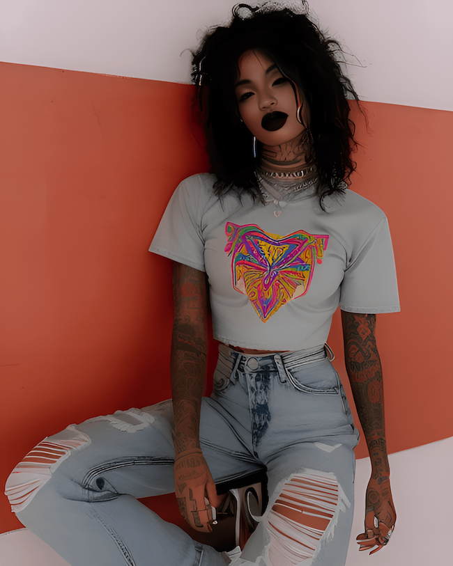 (perfect symmetrical face hyperrealism portrait of a beautiful South African Female, wearing high fashion streetwear, a gothic mtv style ed hardy cypherpunk gray colorful graphic tee, ripped denim, tattoos, piercings, (mtv gothic aesthetic, i want my mtv), (90s style aesthetic), ((photography)), (((captured with a fujifilm xt-3 vintage film))), ((((photorealistic)))), ((precisionism))) [dark, cartoon, ugly, gross, fat, oversized, city, fake, not mtv, 3d, disfigured, bad art, deformed, poorly drawn, extra limbs, close up, weird colors, poorly lit, dark colors, black, white, digital art, unrealistic, mountains, nature, hills, park, field, plain background, not racing car, not formula one, not racing track] -s 55 -S 76160147 -W 640 -H 768 -C 10 -A k_euler_a --hires -I -f 0.45 --fit -G 0.2